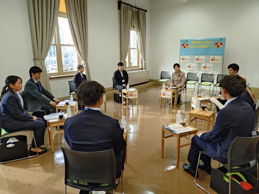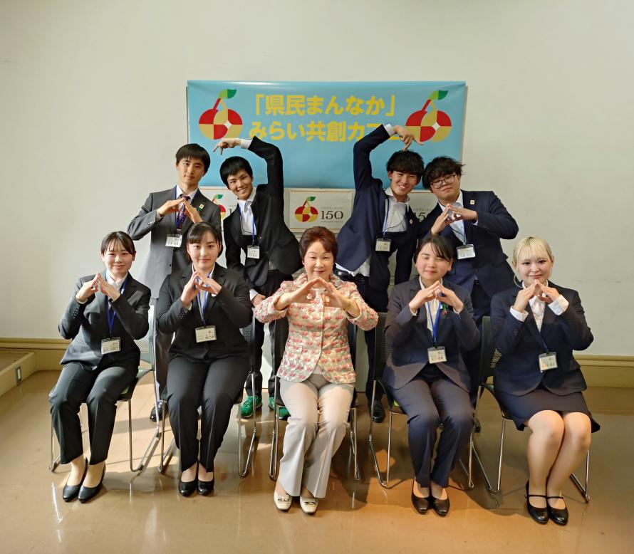 吉村知事と県内大学生の皆さん8名とで、持続可能で明るい山形県の未来に向け「望む山形」をテーマに意見交換を行いました。
